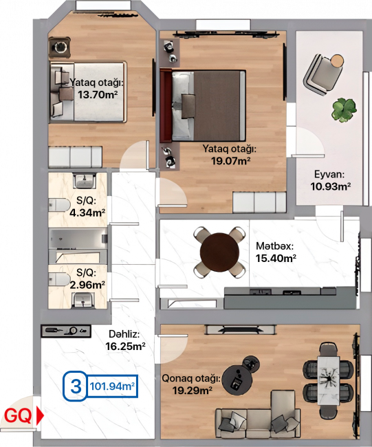 Bina 2A, 3 otaqlı (sağ) mənzil